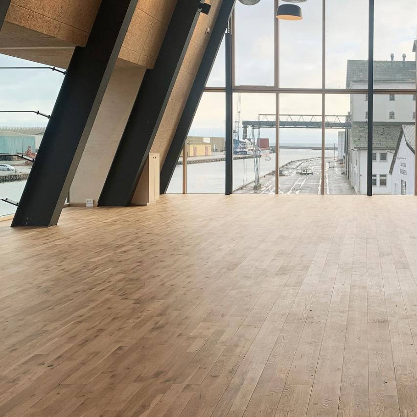 The building houses both a café and a restaurant as well as large event spaces that can be used for private events and by local community groups. The brushed, tactile surface of our Textured Oak floorboards are part of a limited material palette, where both interior and exterior have strong maritime influences. The juxtaposition of steel, accoya and solid hardwood in a rustic finish all contribute to an industrial look, perfectly at home in the harbour.