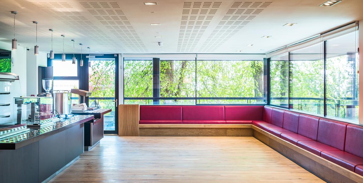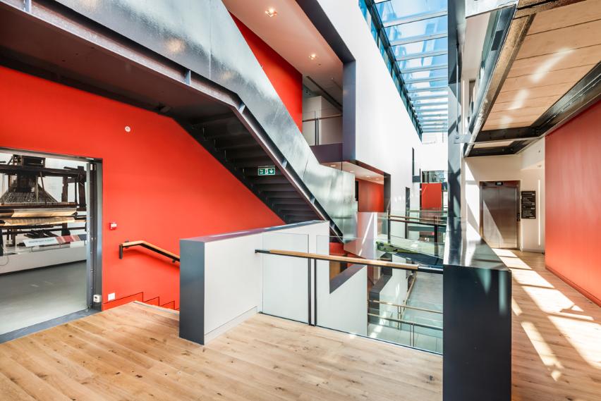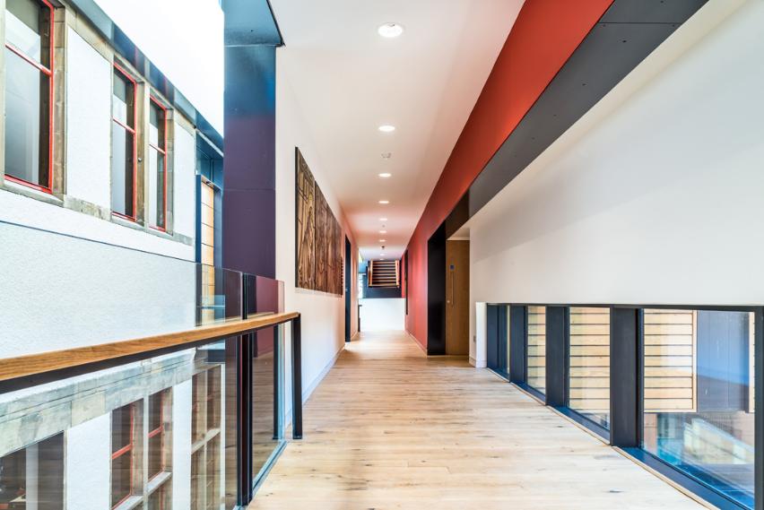To provide a continuous backdrop as well as visually and aesthetically link the old and new parts, our 15mm Wide Board Oak finished in Ultramatt lacquer was specified throughout the building. The attractive grain pattern of the timber adds a natural element to the interior, which is flooded with natural light. Our solid wood flooring offers a durable surface even for high traffic areas. Pre-finished in a choice of hard-wearing, long-lasting lacquers and oils from our own professional range of finishing products, a Junckers floor is easy to install and maintain will last a lifetime with the right care. Particularly popular with architects and designers, our signature long-length plank flooring really comes into its own in a large open space.