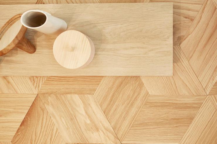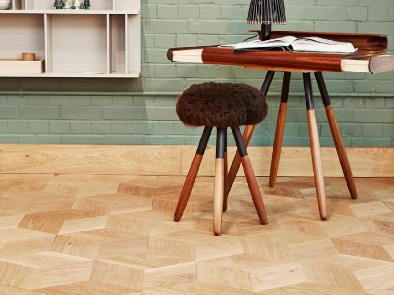 Hexparket by CarpEnter Cph & Hartmann. Hexagonal staves made in solid oak are laid to form an intricate design mimicking nature’s own geometric pattern based on equilateral triangles. The staves measure 370mm on all sides by 20.5mm thick, with an untreated surface to be finished on site. The natural grain structure of the timber adds texture and interest resulting in a lively, elegant floor.