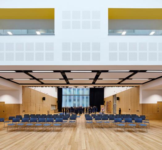 The interior forms an equally dynamic environment for students and staff with teaching spaces arranged around communal halls and generous circulation areas. A large main hall and multi-use space flooded with natural light from two central roof lights, features Junckers wide board oak flooring throughout, providing a natural, unifying backdrop. Junckers’ FSC and PEFC certified floors are a durable, long-lasting choice with low lifecycle costs. Made in solid wood, the floor can be sanded and re-finished multiple times without losing its good looks or performance, ideal for a thriving community school.