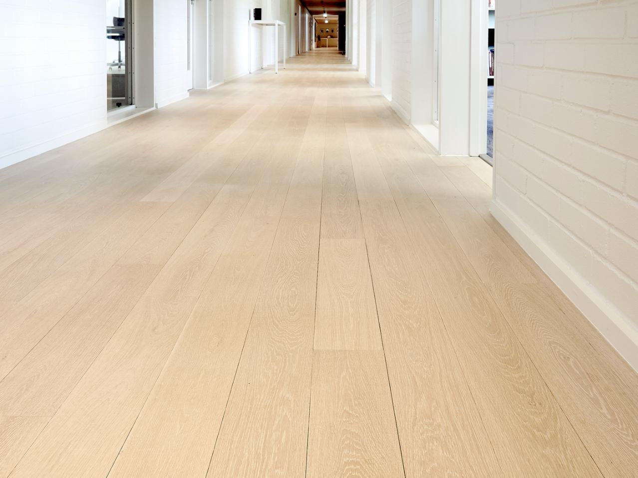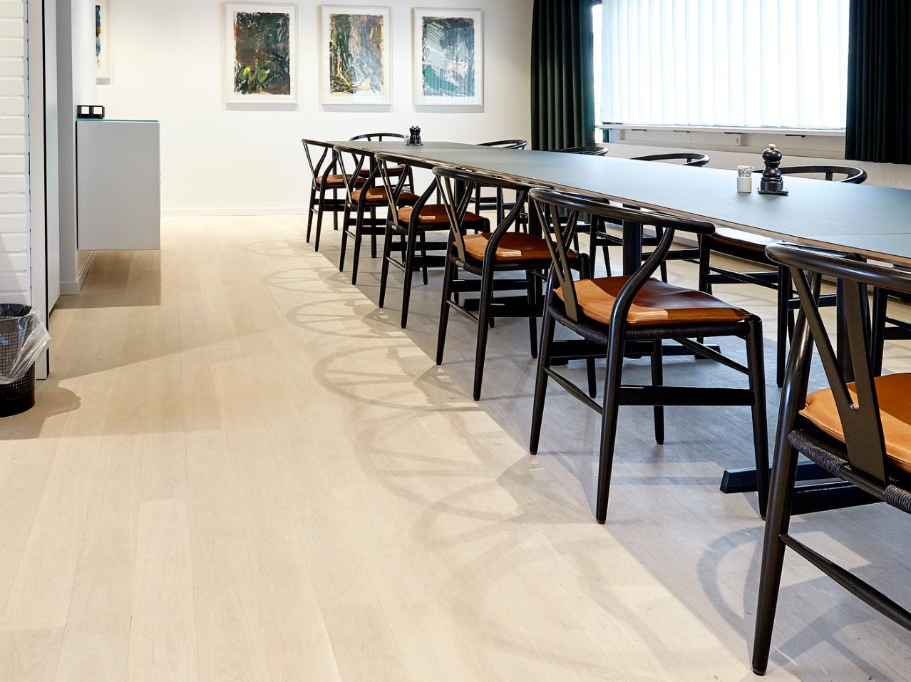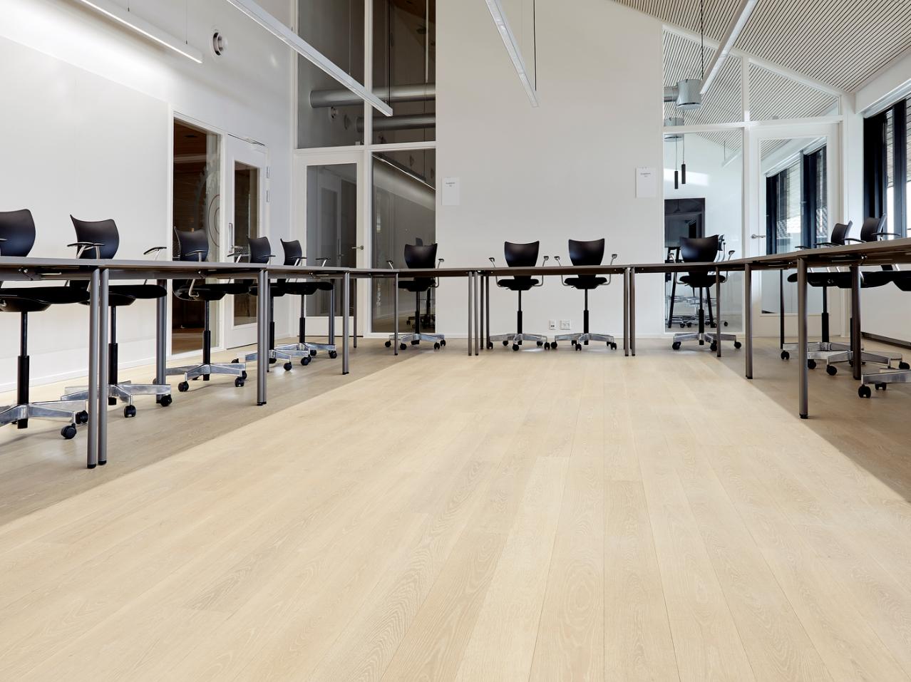 Re-designed by Schmidt Hammer Lassen Architects, Metalskolen conference centre on North Zealand, Denmark, has undergone a complete transformation. The new, contemporary interior features a total of 2,300m2 15mm Oak Classic plank flooring, fitted throughout circulation and breakout areas as well as in all conference rooms. Delivered unfinished, the solid oak flooring was finished on-site using Junckers’ Rustic Oil in White to create a pale floor which reflects a lot of natural light.