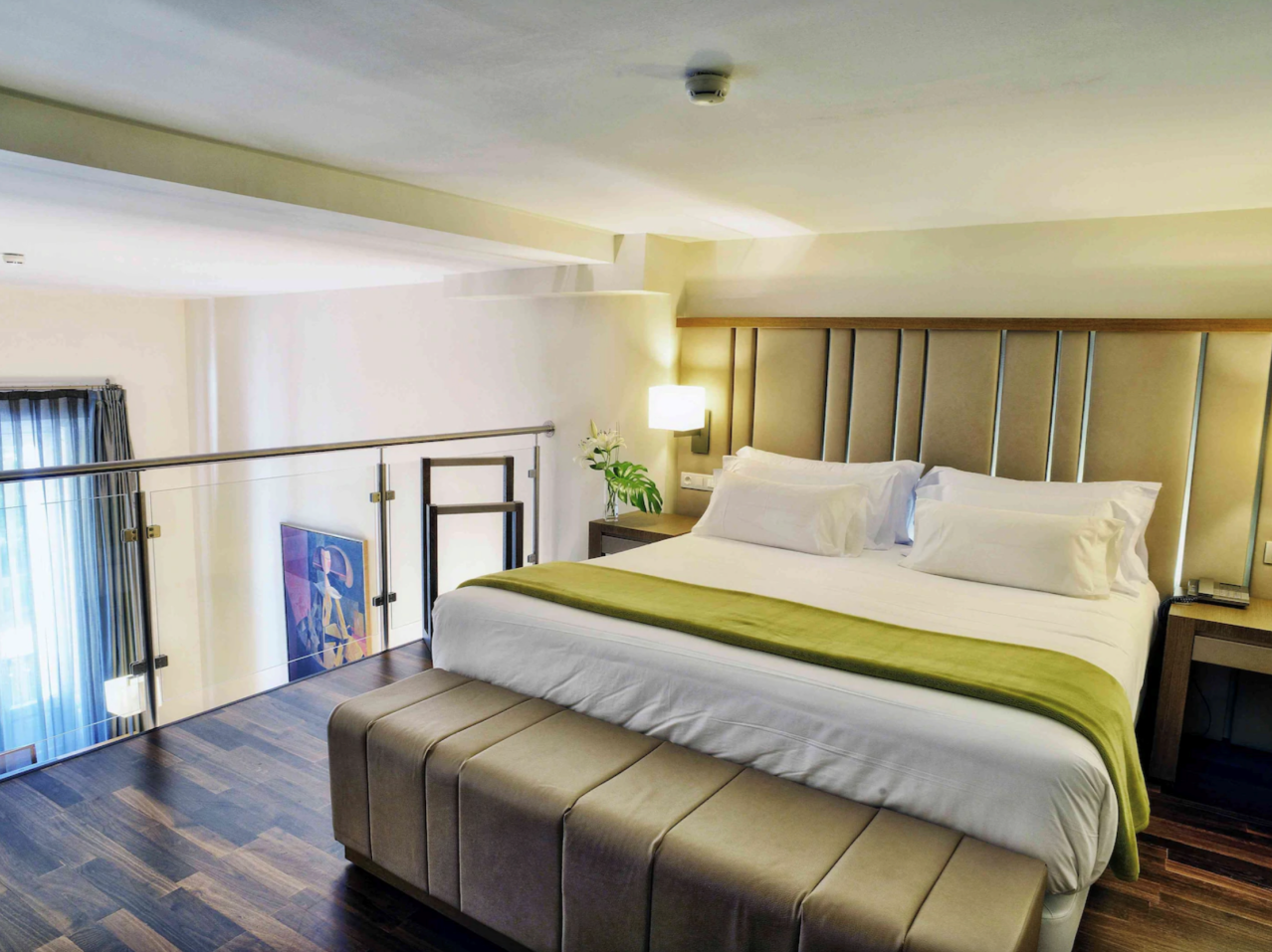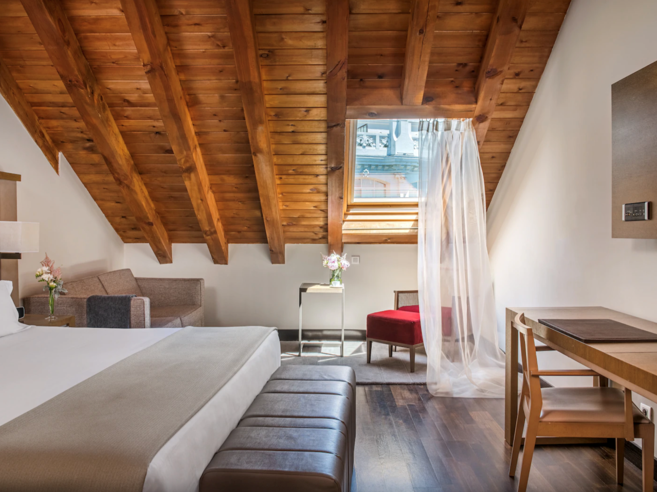 Ramón Esteve Architects made the most of the building’s neoclassical architecture and history to carefully restored the former palace into a luxurious hotel. Vaulted ceilings and original balconies were brought back to their former glory and incorporated into the sleek, contemporary rooms and social spaces. Warm tones of caramel, taupe and ivory with layers of texture added through soft furnishings and fabrics are perfectly complemented by a rich, dark solid wood floor – Junckers Black Oak Harmony.