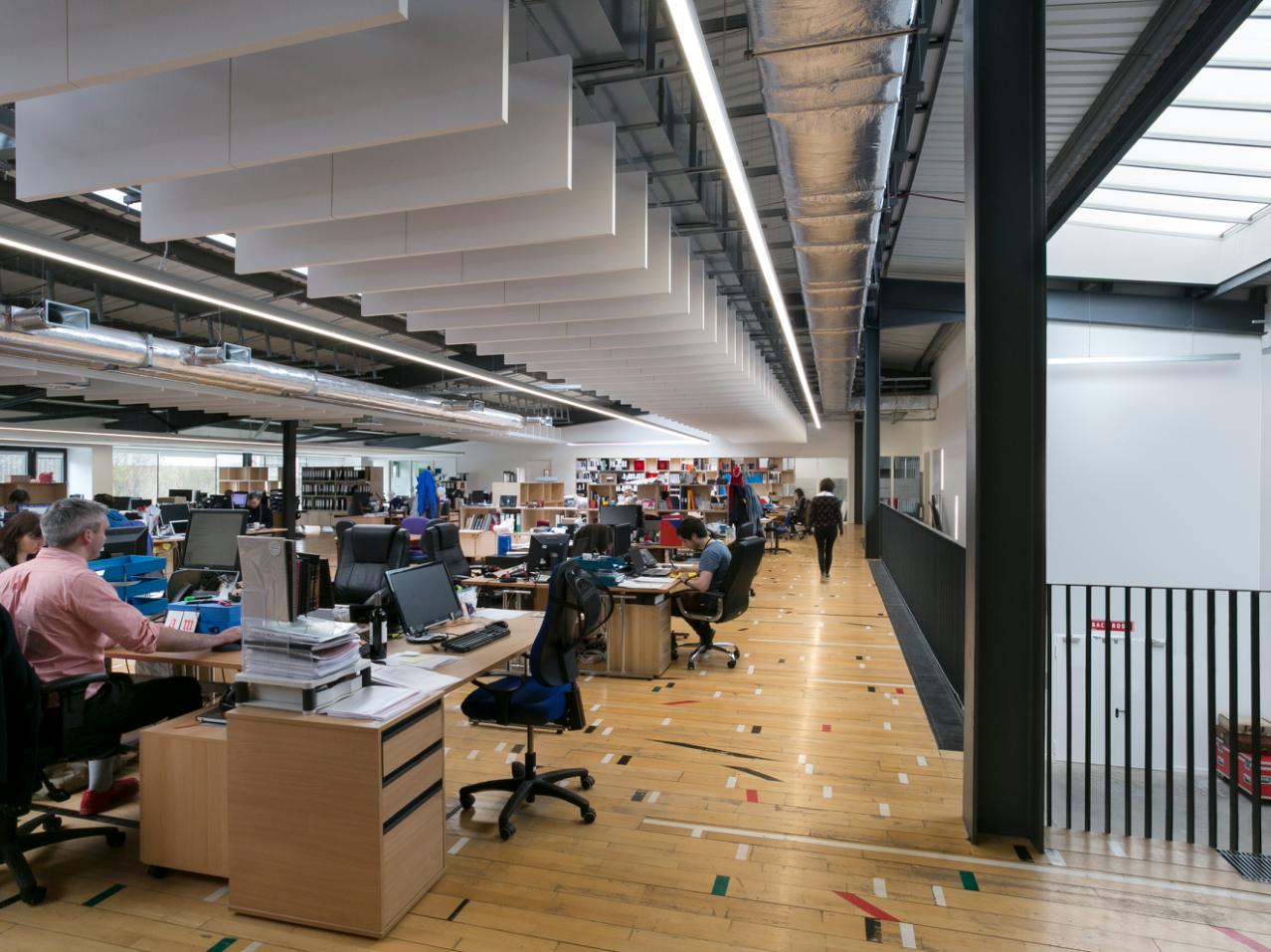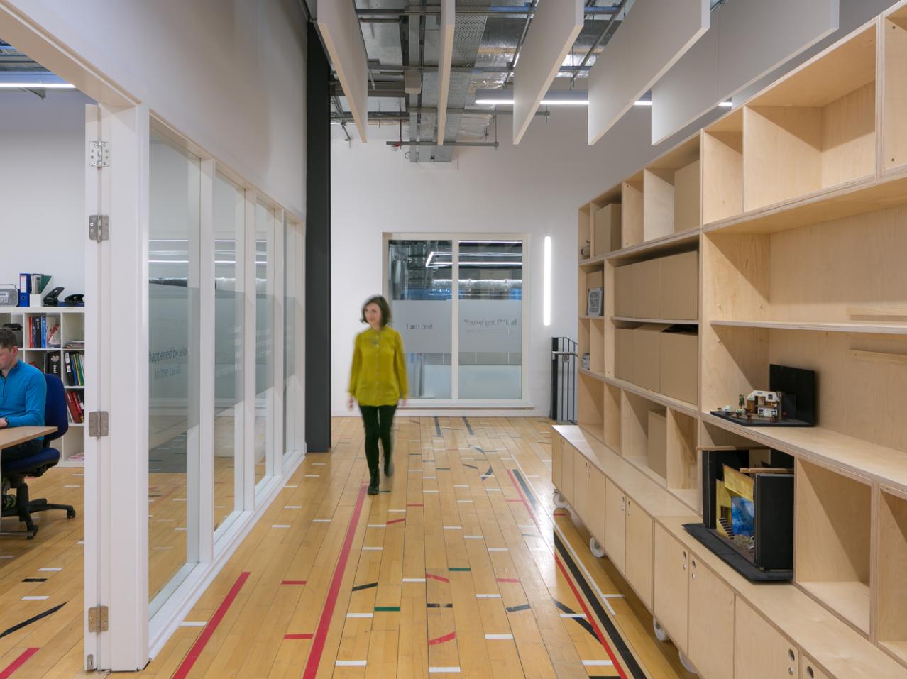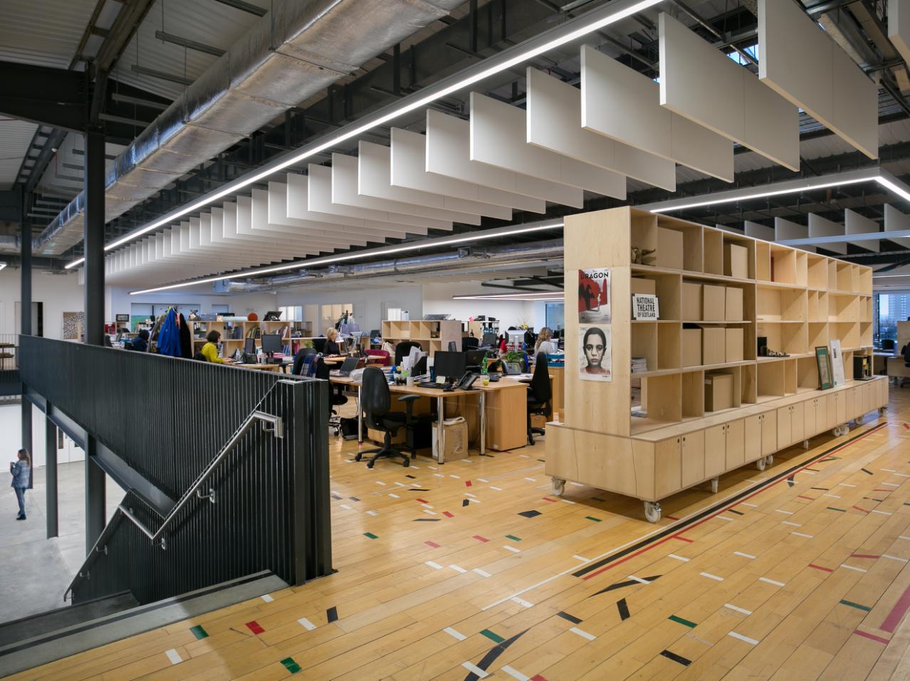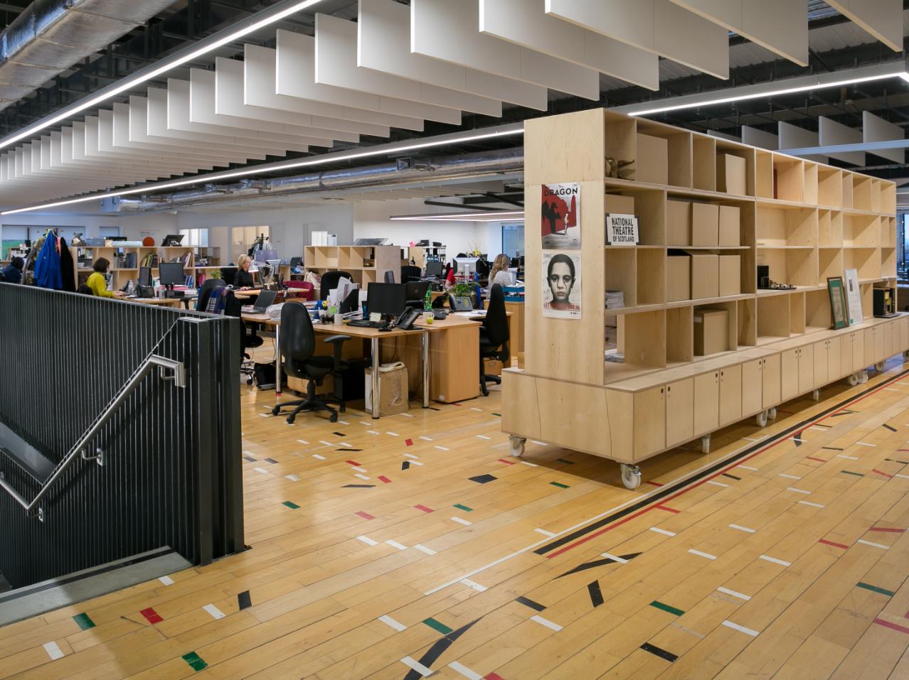 When Hoskins Architects were commissioned to design new headquarters for the National Theatre of Scotland in Glasgow, an ingenious bit of re-using, re-purposing and recycling took place. The new office space and social areas were fitted with a previously used Junckers sports floor, complete with the old line marking paint.