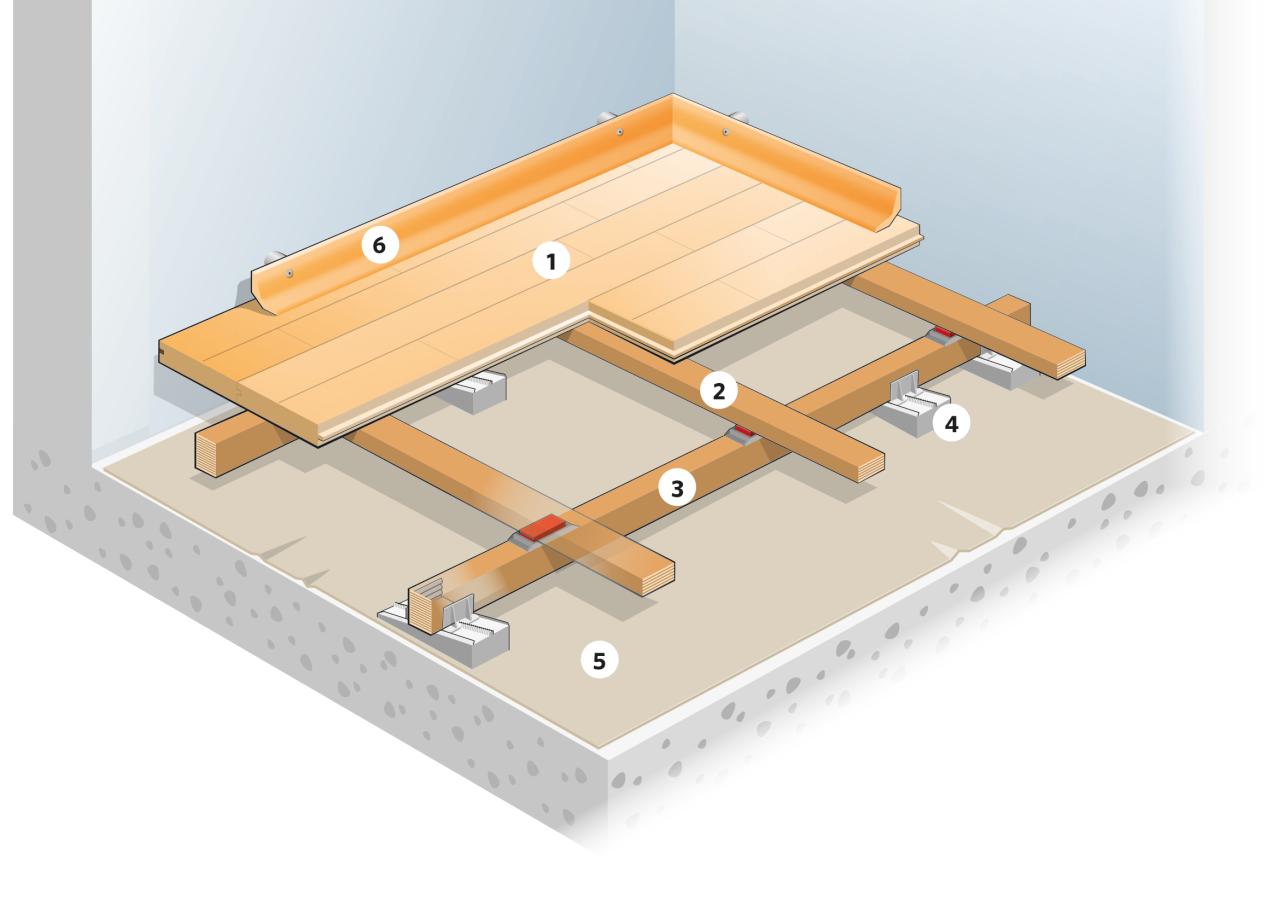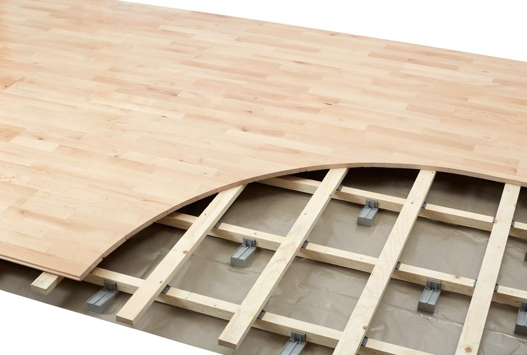 The DuoBat 120+ System provides the ultimate in high performance and safety, along with virtually unlimited leveling flexibility to accommodate all types of uneven subfloors. The 22 mm solid hardwood floor boards are fastened to a subfloor system consisting of 2-layers of cross-laid engineered battens.