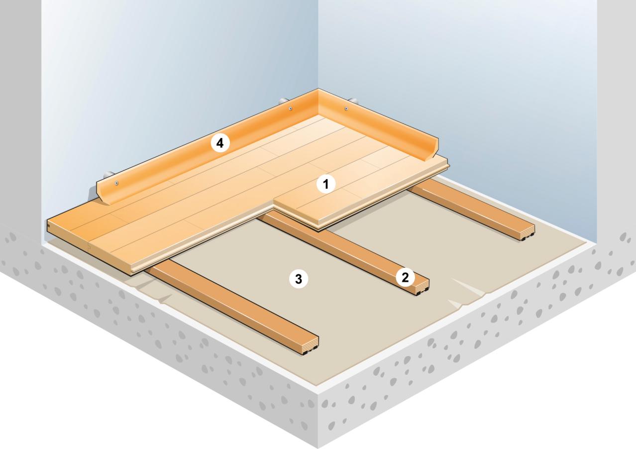 The 22 mm solid hardwood floorboards are fastened to a resilient subfloor consisting of single layer engineered battens with pre-attached special designed shock absorbing foam strips. The shock absorbing foam strips are inset into a “U” shaped channel on the underside of the batten. This design creates a built-in stop block, ensuring the long-term resilience of the system.