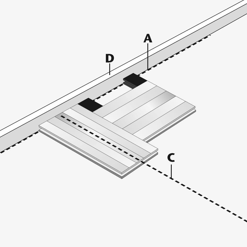 The two centre lines in the room (lines A and C) are marked by a chalk line or string at an angle of 90° to each other.