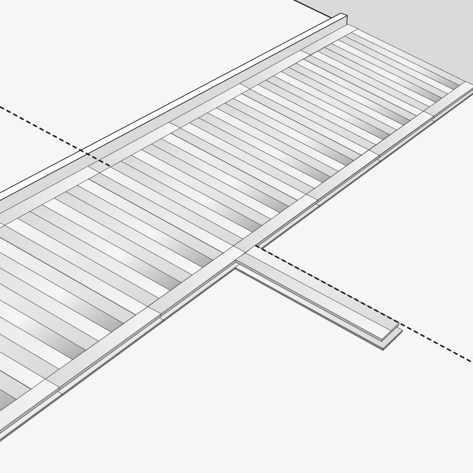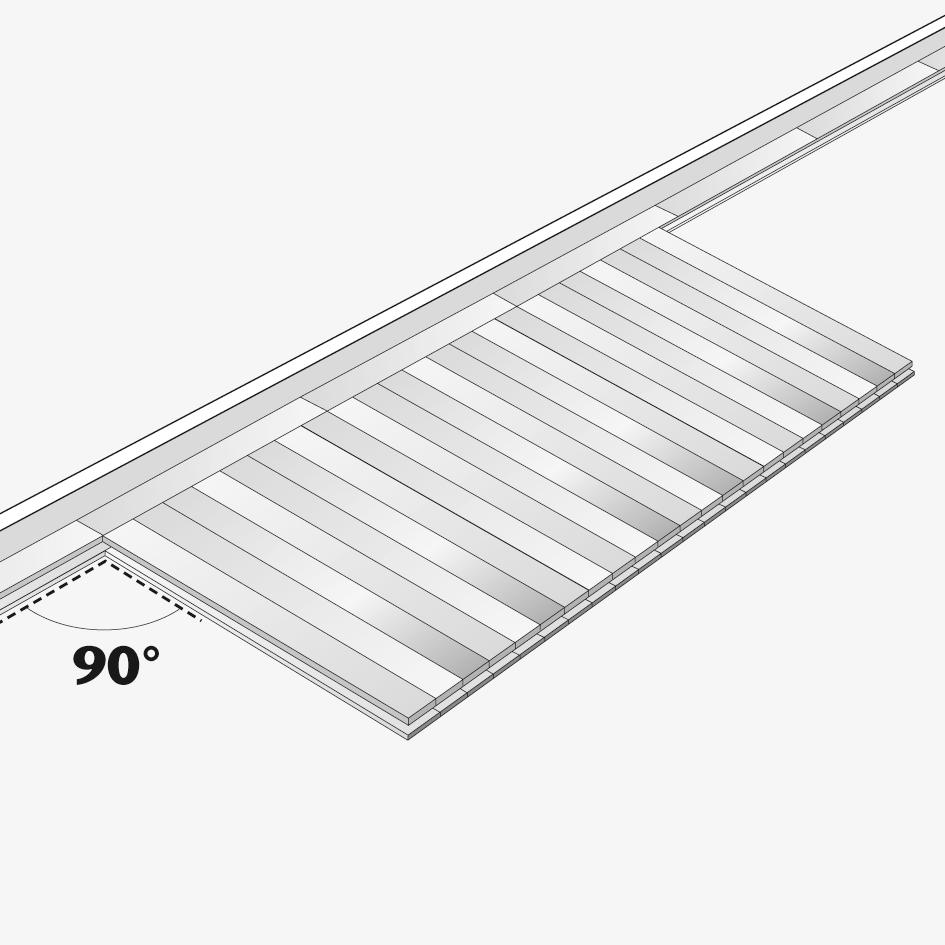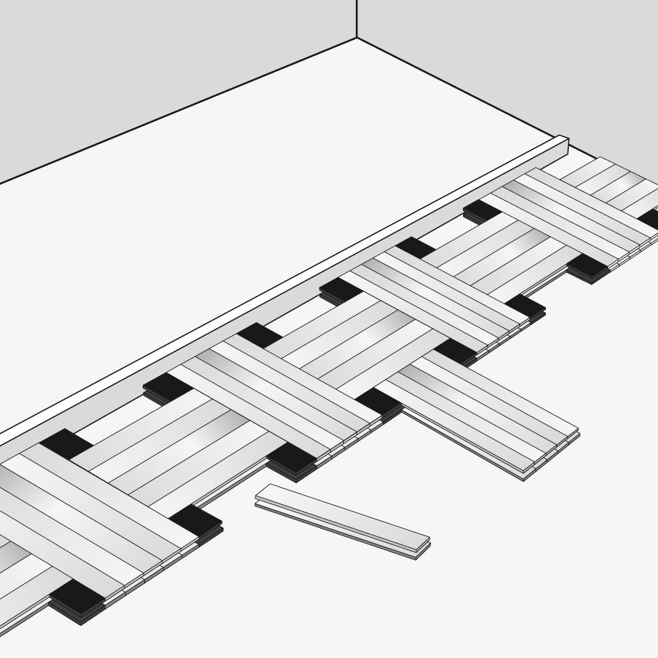 The staves should be laid so that their longitudinal direction is perpendicular to the existing floor boards. In order to achieve the correct surface tolerance, the subfloor can be levelled by planing, filling or by fixing minimum 15 mm thick plywood to the base. If plywood is used, the original laying direction can be used. It is important that the existing wooden floor has been properly fixed without loose boards or protruding fastenings.