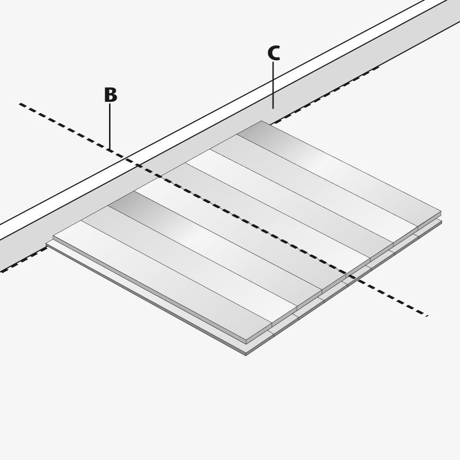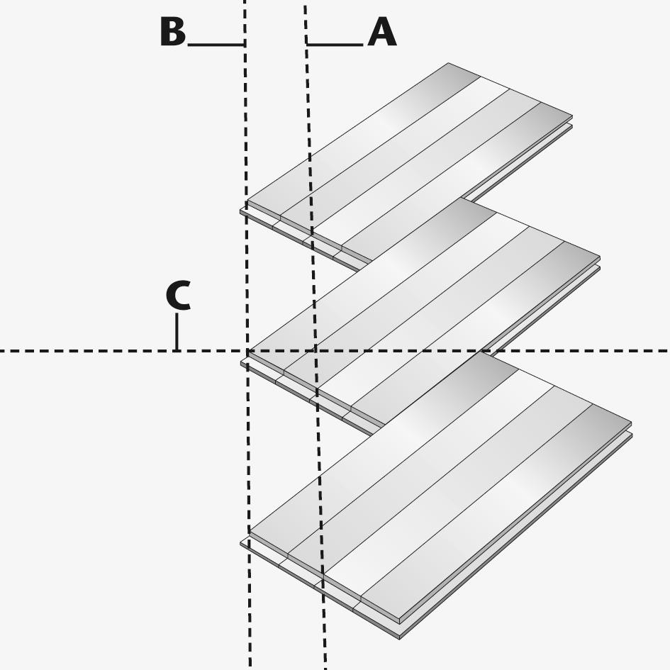 For some patterns, eg. Ladder pattern, where staves are laid in parallel over large areas, it may be necessary to include some expansion allowances within the floor between staves. The amount of expansion allowance to be left is described as the “10 board measure” which is the measurement across 10 staves including expansion gaps.