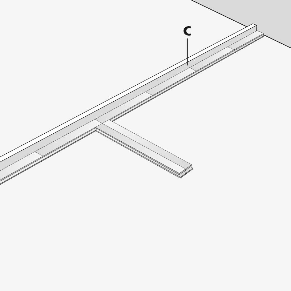 When screwing or nailing, a 500 g/m² floor cardboard is to be inserted between the wooden subfloor and the staves in order to minimize creaking between the staves and the subfloor. Each stave is fixed by secret nailing/screwing at a 45º angle with at least 2 nails or screws per stave.