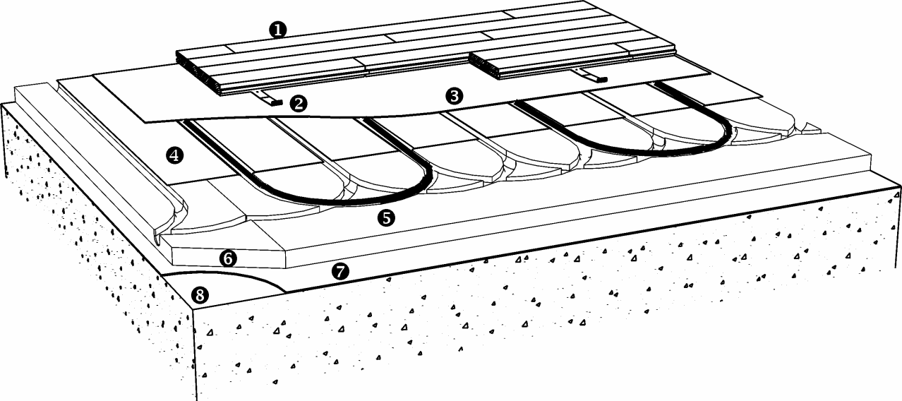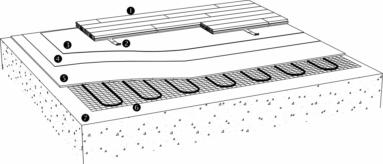Clip floors can be laid on concrete or screeded subfloors with cast-in heating pipes or cables. It is extremely important that the floor heating system is designed to achieve a stable temperature across the surface of the concrete or screed. Following information applies to heating pipes in concrete or screeded floors.